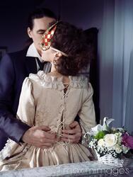 Rights-Managed photo of Sensual romantic couple portrait of a Casanova man in a suit unlacing back of a corset dress, undressing a beautiful elegant lady wearing a Venetian carnival mask. Casanova seduction historic concept in dim vintage indoor settings. Photo by Alex Maxim. This image is available for licensing for a variety of editorial and commercial uses in publications, designs, print and online.