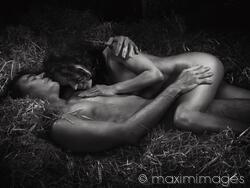 Rights-Managed photo of Beautiful nude sexy couple, a man and a woman, lying naked asleep in a sensual embrace, on straw in a country barn after making love, with dim light shining on their bare skin. Artistic nude, black and white, erotic photograph in countryside indoor night time settings. Photo by Alex Maxim. This image is available for licensing for a variety of editorial and commercial uses in publications, designs, print and online.