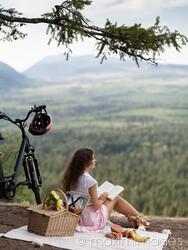 Rights-Managed photo of Young pretty woman in a cute pink skirt sitting on a blanket with fruits reading a book and enjoying a little picnic time in summer nature with a view from a cliff and an electric bicycle by her side. Rear view of an adventurous, dressed in retro style, glamorous girl with long brown hair and sexy bare legs with an e-bike in summertime countryside mountain nature scenery. Photo by Alex Maxim. This image is available for licensing for a variety of editorial and commercial uses in publications, designs, print and online.