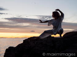 Rights-Managed photo of Woman practicing Tai Chi outdoors in the nature, standing in a martial arts low stance, dark silhouette in white uniform over sunset skies on sea shore rocks Photo by Alex Maxim. This image is available for licensing for a variety of editorial and commercial uses in publications, designs, print and online.