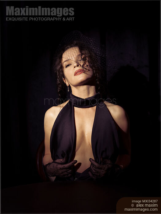 Rights-Managed photo of Expressive sensual portrait of a gorgeous, classy mysterious, elegantly dressed in black, femme fatale lady in a veiled hat with a seductive, provocative expression, and sensual red lips, parting her dress cleavage with her hands, exposing her chest. Dim shadowy settings on black background. Vintage noir style photograph. Photo by Alex Maxim. This image is available for licensing for a variety of editorial and commercial uses in publications, designs, print and online.