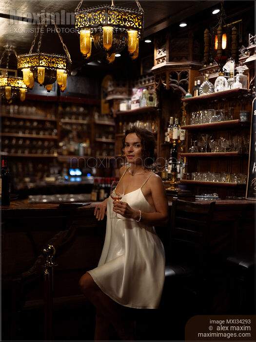 Rights-Managed photo of Portrait of a beautiful classy glamorous lady in a sexy white silk dress sitting alone on a stool at a bar counter in a dimly lit pub drinking wine from a glass looking at a camera with a provocative, flirting expression. Vintage bar dark indoor nighttime settings. Photo by Alex Maxim. This image is available for licensing for a variety of editorial and commercial uses in publications, designs, print and online.