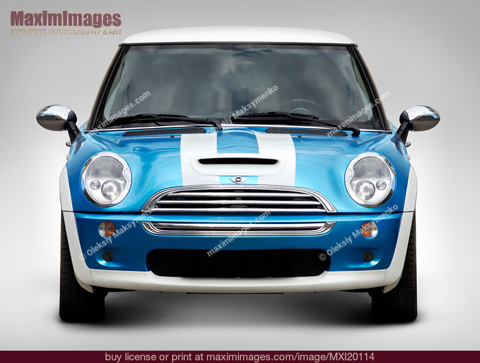 Stock photo of Blue Car Mini Cooper front view Buy commercial use license at MaximImages