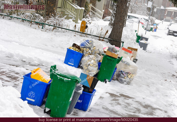 Image keywords: garbage, bins, trash, street, recycling, litter, recycle, waste, winter, wintertime, snow