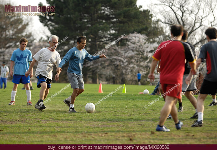 Stock photo of Adults and Seniors Playing Soccer Buy commercial use license at MaximImages