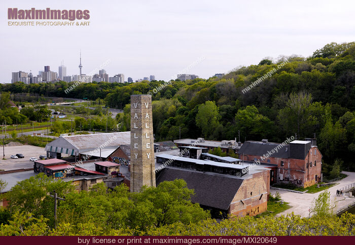 Old industrial buildings of Don Valley Brick Works with Toronto downtown skyline and CN Tower in the background Currently Evergreen plans to develop these abandoned buildings into a cultural centre with a focus on the environment
