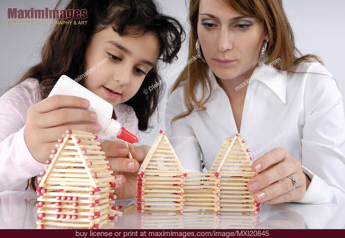 Mother and daughter building house from matches together