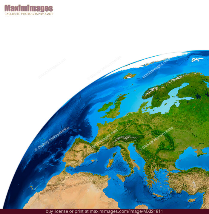 View of the Earth globe from space showing European continent. Isolated on white background.