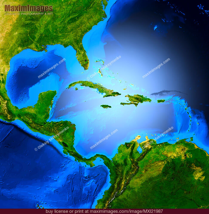 Detailed 3D render of the map of Central America showing the Caribbean sea, The Gulf of Mexico, Cuba, Haiti, Dominican Republic, Mexico, Jamaica, the Bahamas etc.