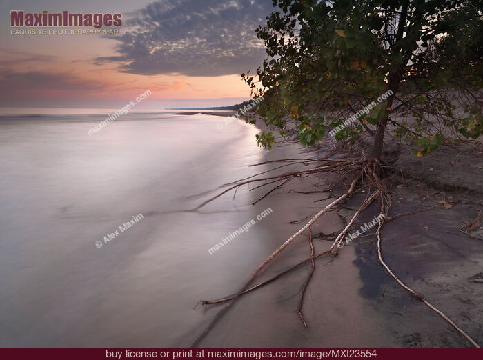 Image keywords: beach, water, landscape, shore, tree, roots, washed, shoreline, sunset, lake, erie