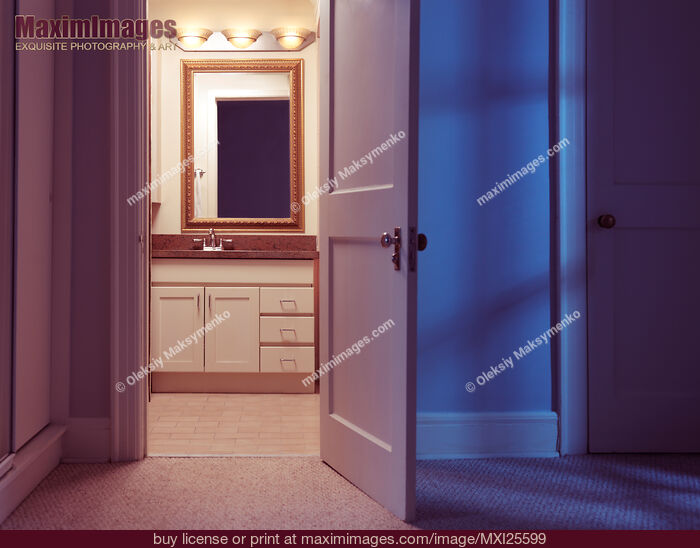 Image keywords: bathroom, door, open, night, nobody, apartment, empty, ajar, light, dark, mirror