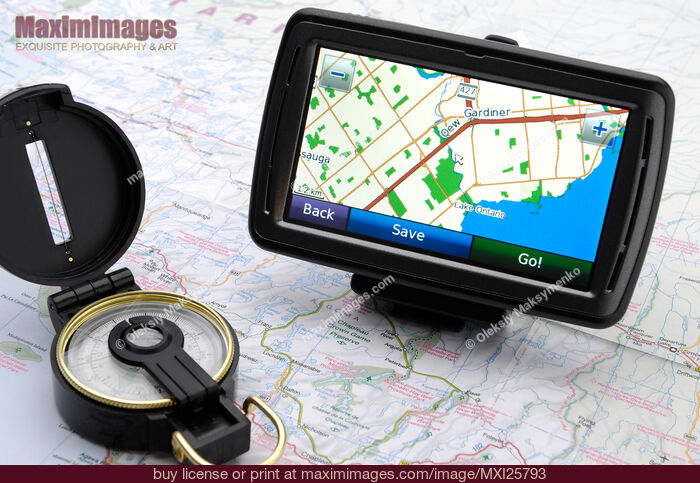 Stock photo of Automotive GPS on map with compass Buy commercial use license at MaximImages