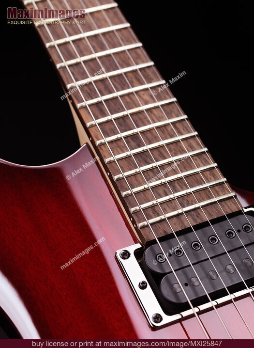 Stock photo of Closeup of electric guitar neck and strings Buy commercial use license at MaximImages