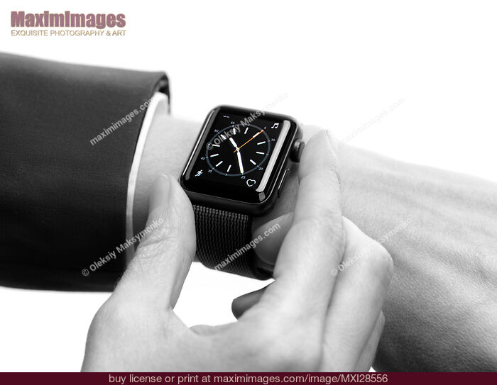 Stock photo of Woman hand with Apple Watch showing time Buy commercial use license at MaximImages