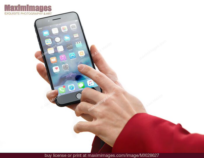 Closeup of a person hand holding iPhone 7 plus smartphone, Apple device. Woman hand with a finger touching the phone's display isolated on white background.