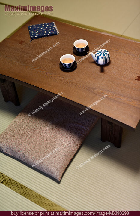 Stock Photo of Japanese short-legged wooden tea table Chabudai teapot and cups