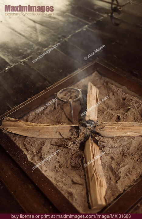 Stock photo of Historic Japanese rural house interior with Irori sunken hearth fire pit fireplace in floor Buy commercial use license at MaximImages