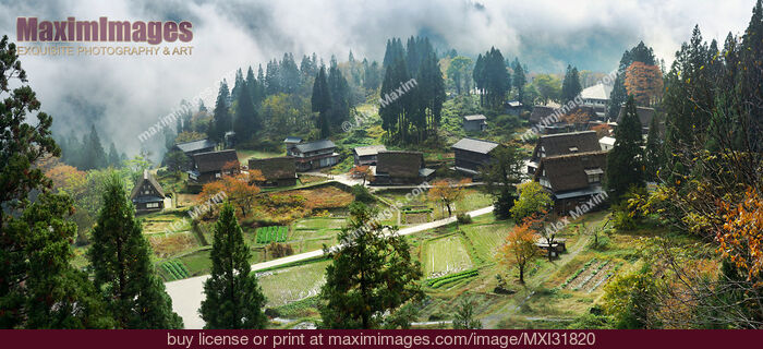 Stock Photo of Japanese mountain village Ainokura with Gassho-style traditional rural houses in panoramic aerial autumn scenery