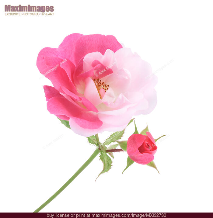 Stock Photo of Half pink half white Damask Rose bi-color sporting flower and a bud on a stem isolated on white background
