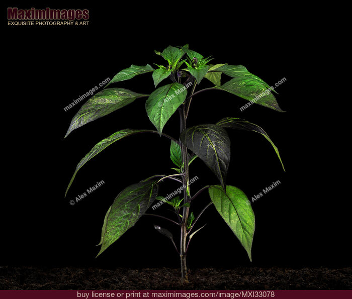Stock Photo of Purple Japanese sweet pepper plant Murasaki growing in soil isolated on black