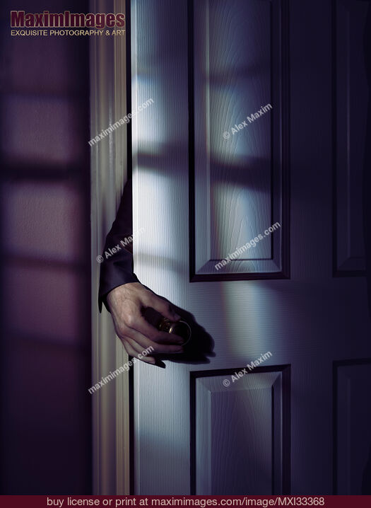 Stock Photo of Spooky male hand reaching for a door handle from behind a room door at night