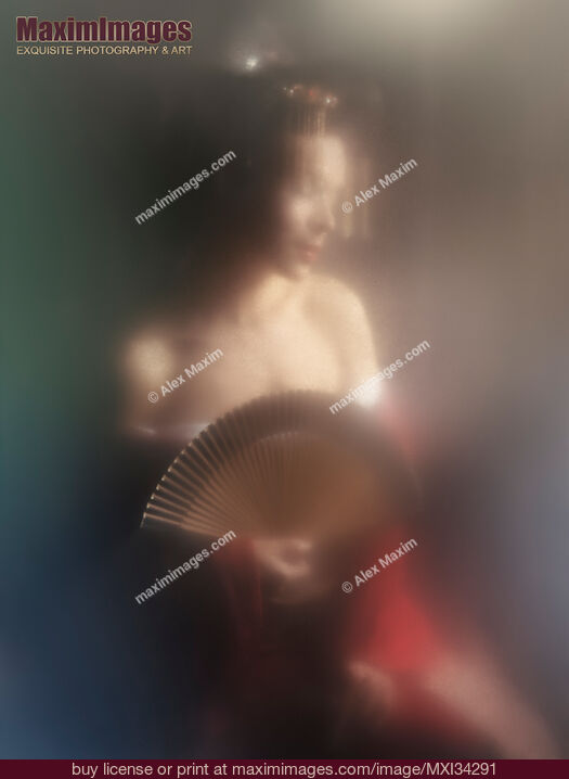 Stock Photo of Surreal portrait of beautiful Japanese geisha or courtesan with sensually bared shoulders behind misty glass