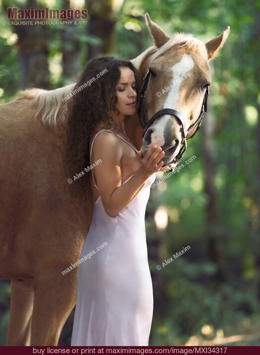 Stock Photo of Beautiful woman rider in elegant dress caressing a horse in nature with tender relaxed expression